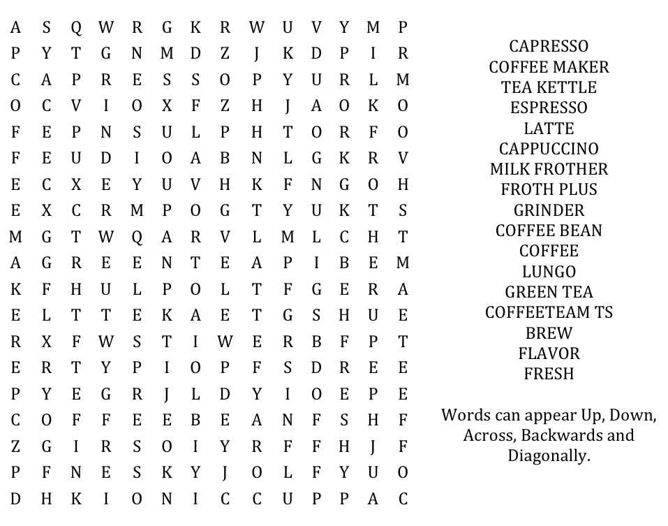 Capresso Word Search 05/24/201206/05/2012 Exercise your mind while sipping on your morning cup of coffee or tea. Our Capresso Word Search is a fun way to start your day. Share this: Click to share on X (Opens in new window) X Click to share on Facebook (Opens in new window) Facebook Like Loading... Related