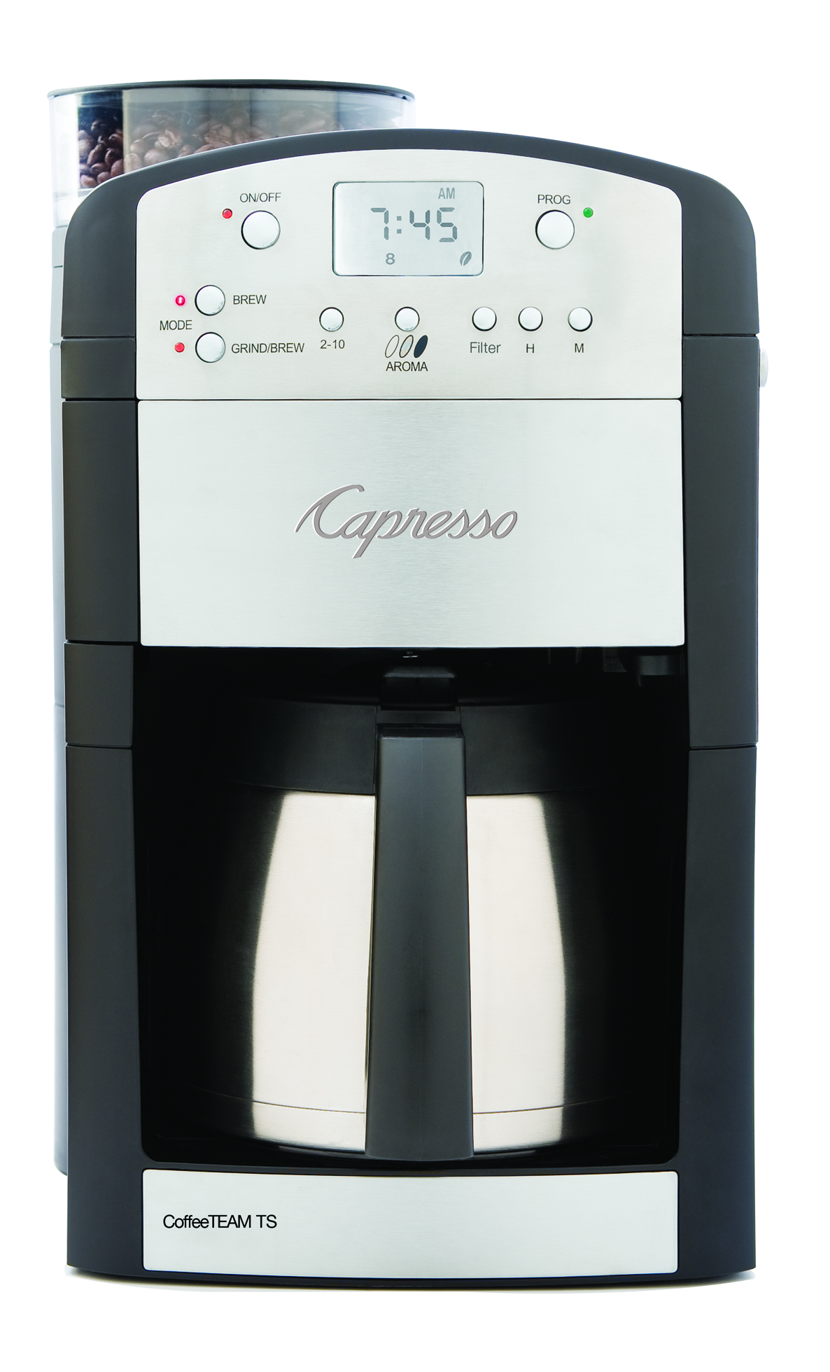 Featuring a built-in conical burr grinder and a sleek stainless steel thermal carafe, the Capresso CoffeeTEAM TS delivers a perfect grind and brew every time for the freshest coffee taste and aroma. A glass carafe is also available in the Capresso CoffeeTEAM GS.