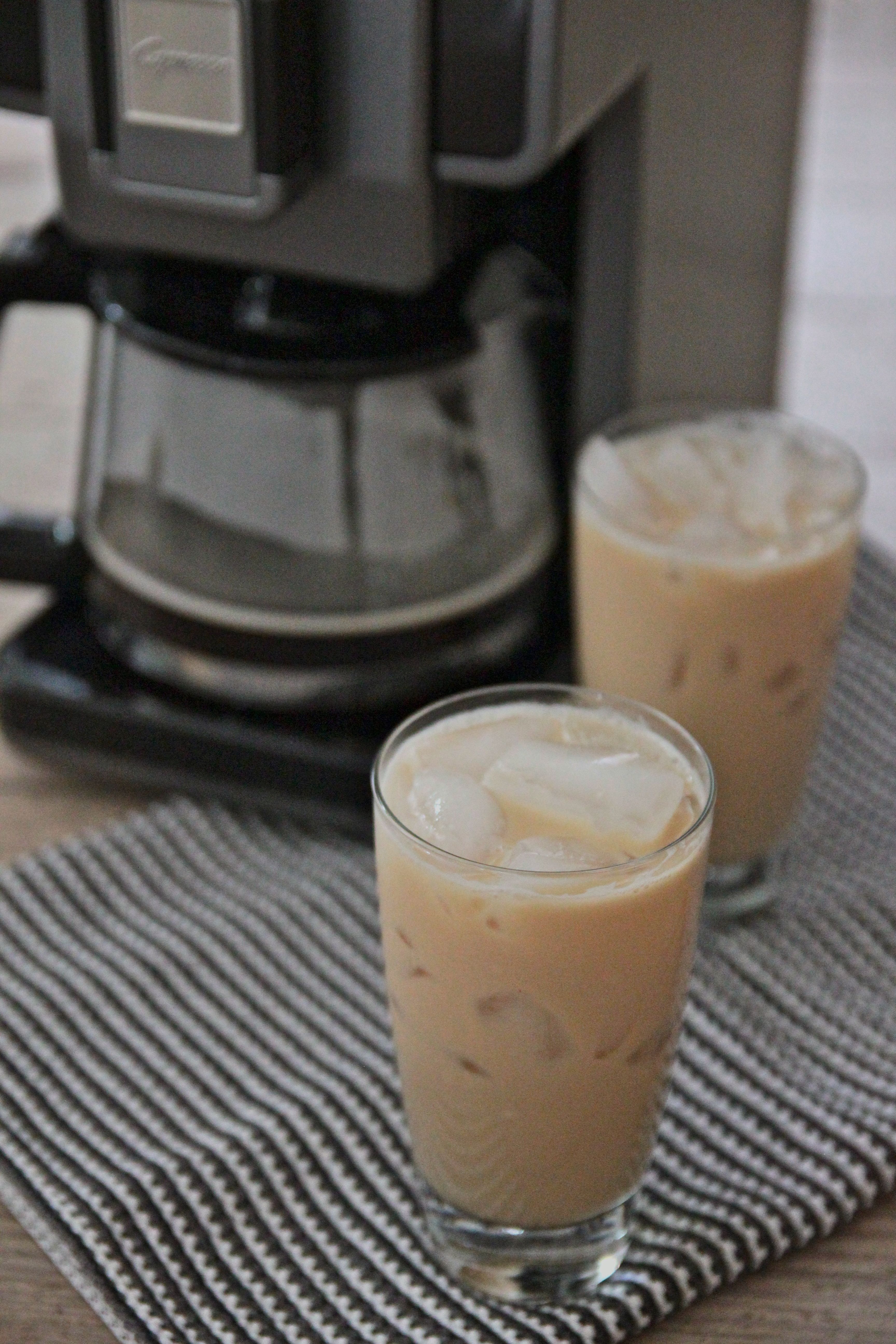 Fill the water tank with only 16 ounces of water and place water tank back onto your Coffee à la Carte. Add ground coffee to black coffee filter. Attach black coffee filter onto the brewing unit and insert brewing unit with filter into the Coffee à la Carte. Remove drip tray and place coffee carafe onto heating plate. Press the carafe button to begin brewing. Once machine has stopped brewing, pour coffee into a container (with spout) for mixing. Add sweetened condensed milk and stir well until dissolved. Refrigerate until cool. To serve, place ice cubes into the bottom of each glass and pour coffee mixture over the top. Top with evaporated milk. Enjoy!