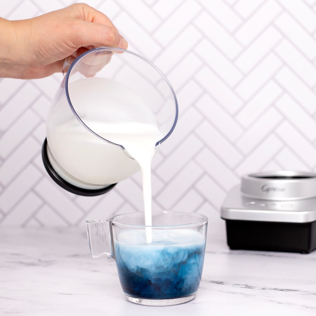 First heat water in your Capresso Pour-Over-Kettle to 185F. Place 2 tsp of butterfly pea tea into your tea infuser and set inside your tea cup. Pour the hot water over the tea and steep for 3-4 minutes before removing the tea infuser. Meanwhile, pour 4 ounces of milk into Capresso froth Max and press the HOT button. Once the frother has automatically shut off, add honey to your tea, pour in your shot of espresso and pour frothed milk over your blue tea watching the colors unfold.
