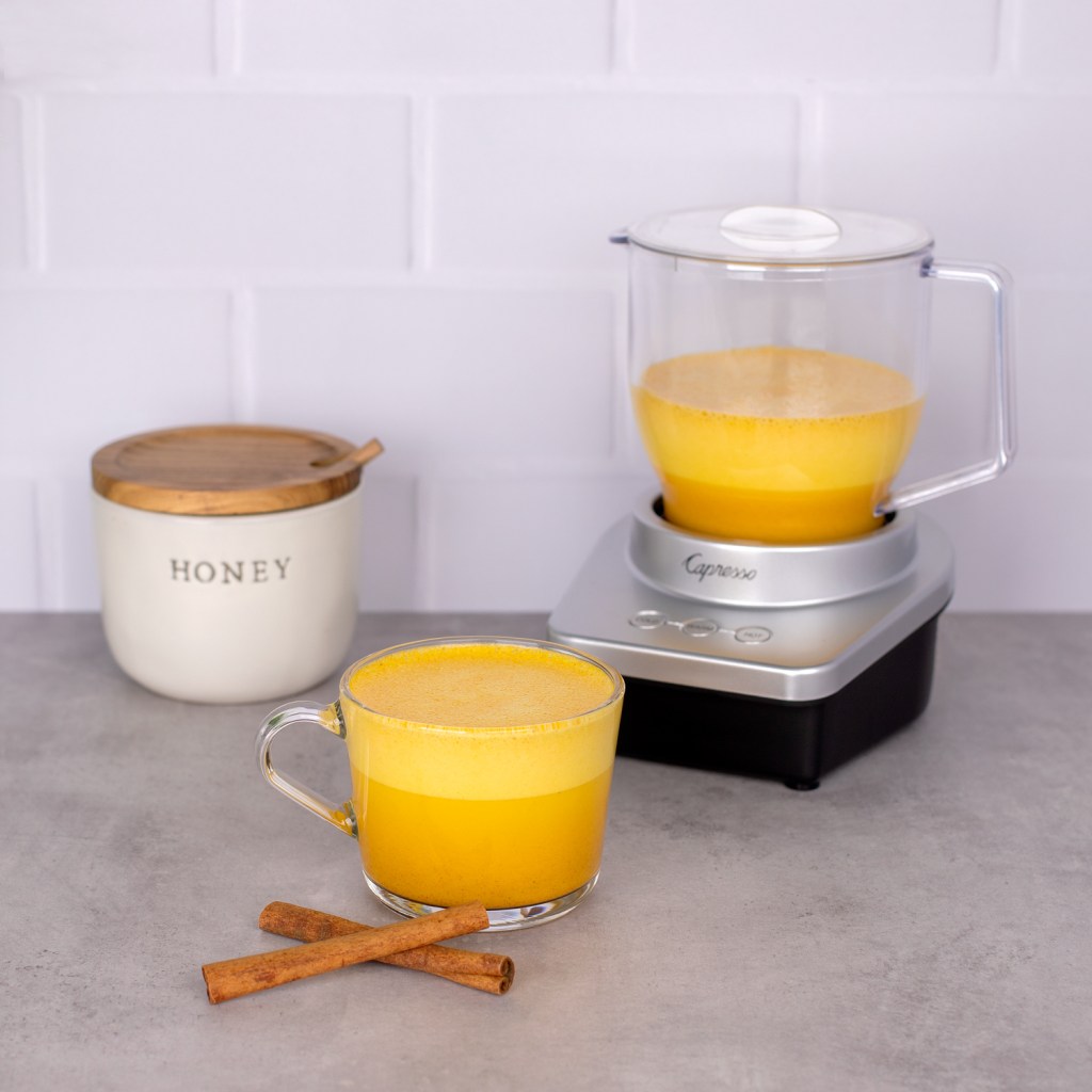 Pour almond milk into the pitcher of the froth MAX, and press the “hot” button. Once the frother starts mixing add the turmeric and honey and place the lid on top of the pitcher. When the frother automatically shuts off, pour the golden milk into a glass. Garnish top with a pinch of ground cinnamon. Enjoy!